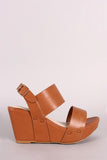 This casual wedge features an open toe silhouette, double bands across vamp, slingback with side buckle closure, and studded side accent. Finished with a lightly padded insole and partially hidden platform wedge heel.