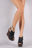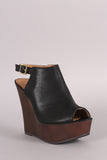 These wedges feature a peep toe silhouette, center seam detail, back cutout design with buckle strap closure, faux wooden platform, and wedge heel. Finished with lightly padded insole for comfort.
