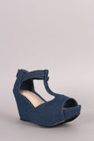 This lovely peep toe wedge features a denim throughout, T-strap design, double ankle strap with partial elastic insert, covered platform, and wedge heel. Finished with a lightly padded insole and rear zipper closure for easy on/off.
