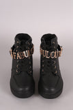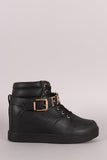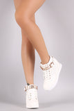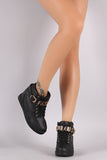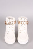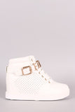 This high top wedge sneaker features a rounded toe, perforated design, side buckle accents, and decorative ankle strap with the word "FABULOUS" inserted. Finished with a hidden wedge heel, cushioned insole, padded collar/tongue, and lace up closure.