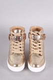 This high top wedge sneaker features a cracked metallic vegan leather upper, rounded toe, perforated design, side buckle accents, and decorative ankle strap with the word "FABULOUS" inserted. Finished with a hidden wedge heel, cushioned insole, padded collar/tongue, and lace up closure.