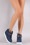 This high top wedge sneaker features a rounded toe, perforated design, side buckle accents, and decorative ankle strap with the word "FABULOUS" inserted. Finished with a hidden wedge heel, cushioned insole, padded collar/tongue, and lace up closure.