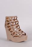 These wedges are elevated on a platform, featuring a cutout cage with an adjustable rear back zipper. Peep toe.