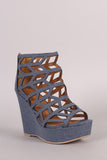 These wedges are elevated on a platform, featuring a cutout cage with an adjustable rear back zipper. Peep toe.