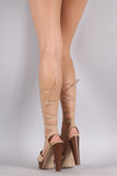This stunning lace up closure, peep toe silhouette, tribute platform, chunky stacked heel, and lightly padded insole for comfort.