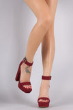 This elevated open toe heel is on a square platform and chunky heel. Features classic ankle strap with an adjustable buckle.