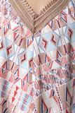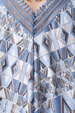 This dress features a v-neckline with embroidery lace trimming, spaghetti self-tie halter straps, backless design, trapeze cut fit, midi length, and tribal pattern print throughout. Accessories sold separately. 100% Polyester.