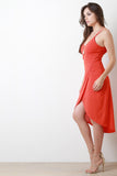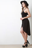 This sexy dress features a v neckline, knit fabrication, adjustable multi strap design, low cut back, high low hem, wrap front cut, and a full lining. Accessories sold separately. Self: 92% Polyester, 8% Spandex. Lining: 100% Polyester.
