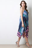 This dress features a v-neckline, adjustable spaghetti shoulder straps, handkerchief hemline, and bohemian pattern print design. Accessories sold separately. 100% Polyester.