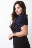 This plus size cardigan features an open front with shawl collar design, ruched short sleeves, and crop hem. Accessories sold separately. Made in U.S.A. 97% Rayon, 3% Spandex.