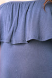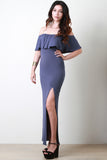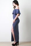 This maxi dress features bardot neckline, flutter tier, sculpture fit, and a high vent slit at left side. Accessories sold separately. Made in U.S.A. 95% Polyester, 5% Spandex.