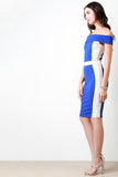 This alluring midi dress features a curve-enhancing colorblock design, wide banded off the shoulder neckline, and rear zip-up closure. Accessories sold separately. Made in U.S.A. 65.5% Rayon, 30.5% Nylon, 4% Ponti.