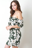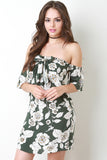 This bardot dress features an elasticized off the shoulder neckline, short sleeves, flutter tier with a self-tie center bow, shift cut, and hibiscus floral print. Accessory sold separately. 100% Rayon.