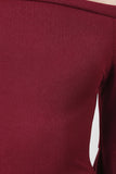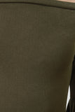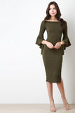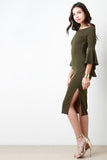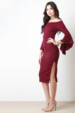 This midi dress features stretch fabric, off the shoulder neckline, long bell sleeves, and side slit. Accessories sold separately. Made in USA. 95% Polyester, 5% Spandex.